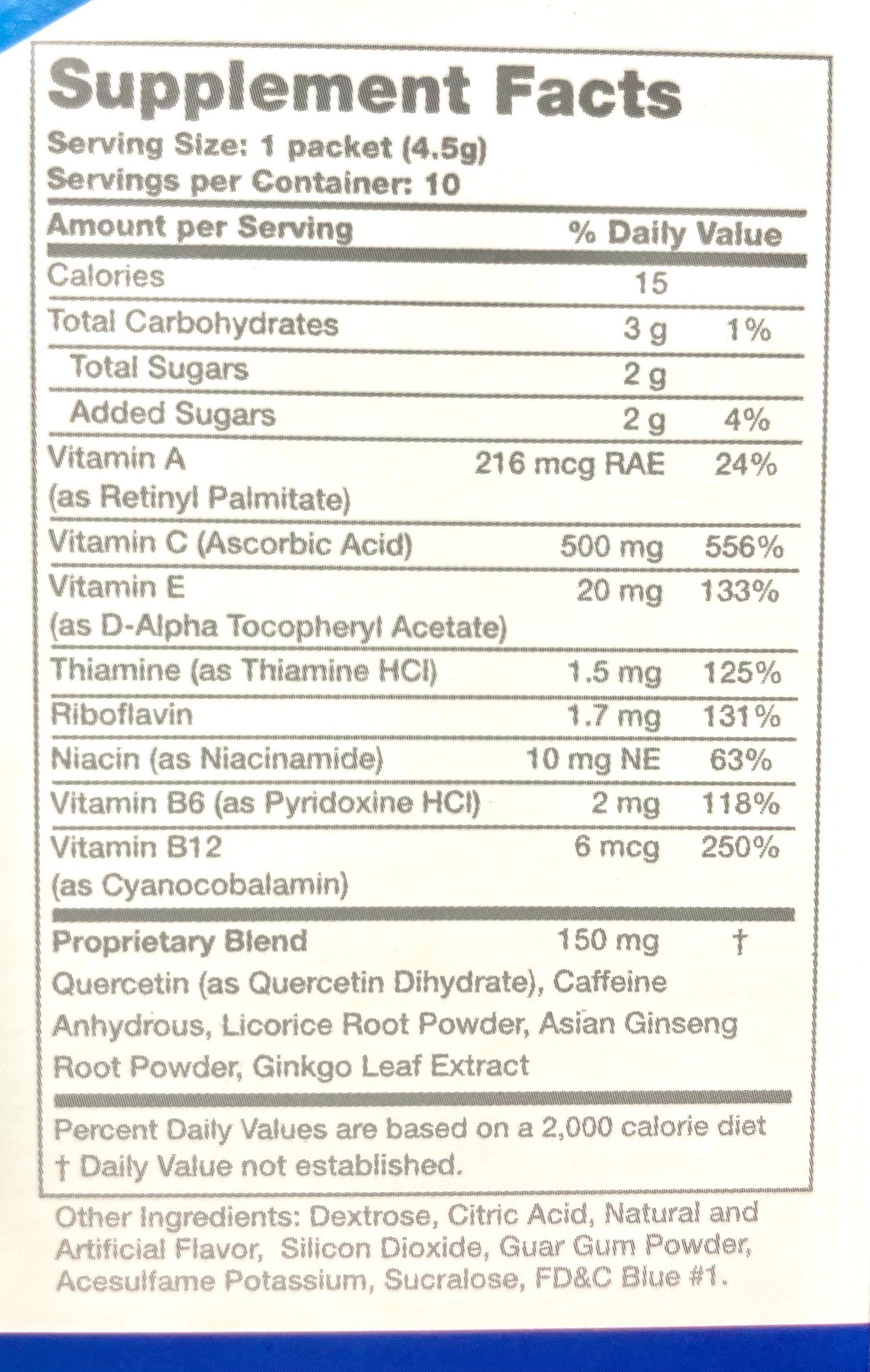 Other Ingredients: Dextrose, Citric Acid, Silicon Dioxide, Guar Gum Powder, Natural Flavor, Acesulfame Potassium, Sucralose, FD&C Blue #1.